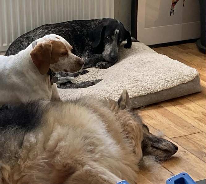 “Jerry is keen to meet new dogs and people, wherever we go, including evenings in ‘the Local’! His tail never stops wagging (unless he’s pointing). We are lucky enough to live near unused fields with an adjacent golf course so have been working on his recall which is coming along well, although he is most definitely a bird dog! He and Christy spend time every day just happily running and their joy is infectious. They are well known in our neighbourhood as Jerry and Christy are joined on their evening pack walk by the kittens, Alba and Jura. Jerry will have his first blood tests (for Leish) with us in January 2026, but whatever these or future results bring,  he has found his forever home surrounded by love and comfort.”